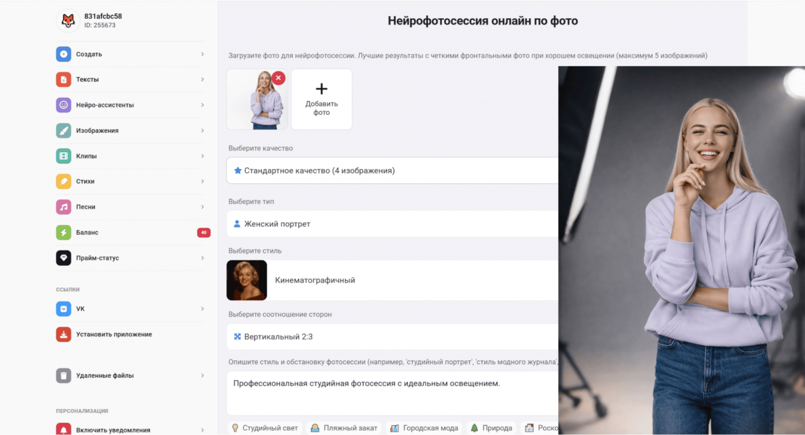 Еще один ИИ-редактор для творческого преображения портретных снимков. С его возможностями можно смело отменять коммерческую съемку, а профессиональные кадры получить через «Нейрофотосессию». В этом режиме можно получить до четырех студийных портретов.