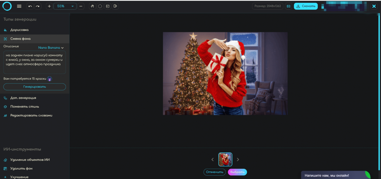 «Нейрохолст» — веб-редактор исключительно с ИИ-функциями. Он содержит два модуля — для создания иллюстрации нуля или дорисовки пользовательского фото, а также AI-инструменты. Умный сервис хорошо прорисовывает детали на новом фоне, а промт можно писать на русском языке.