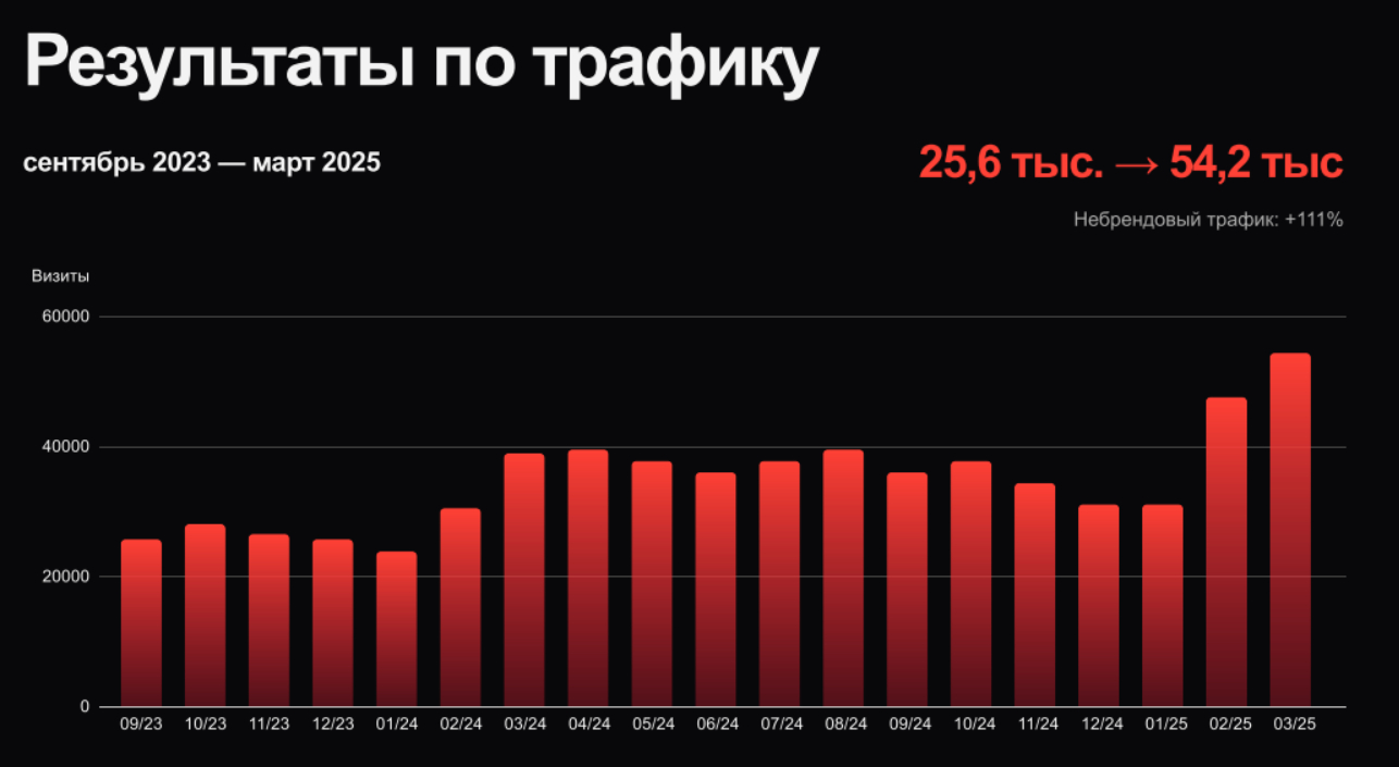 Поэтому мы выбрали другой путь — отстроиться по качеству, глубине и релевантности. И именно это позволило нам не только «вернуть» трафик производителю, но и превратить сайт в главный источник заявок.