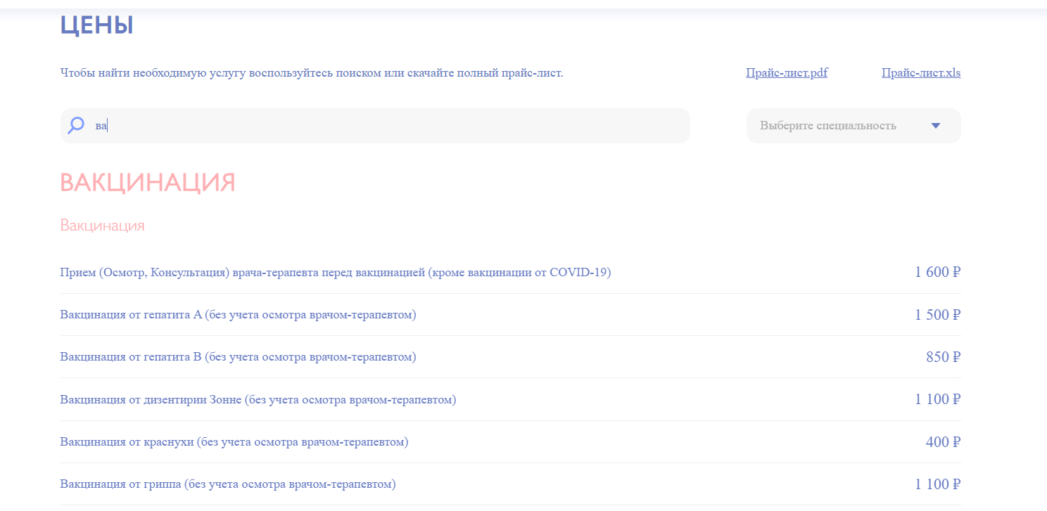 Например, для медицинского центра (NDA) мы переработали страницу Прайс-лист и добавили моментальный поиск: результаты появляются уже после двух введённых букв.