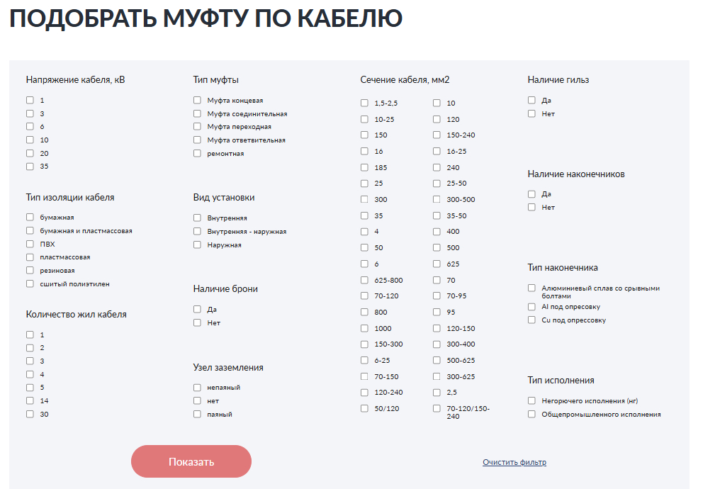 На сайте производителя электромонтажных изделий (NDA) мы внедрили умный фильтр подбора кабельных муфт, который автоматически исключает неподходящие варианты и показывает только релевантные.