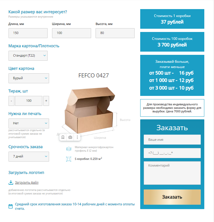 А для проекта производителя упаковки (NDA) создали онлайн-калькулятор расчёта стоимости коробок. Посетители мгновенно видят цену изделия — это увеличило средний чек и число индивидуальных заказов.