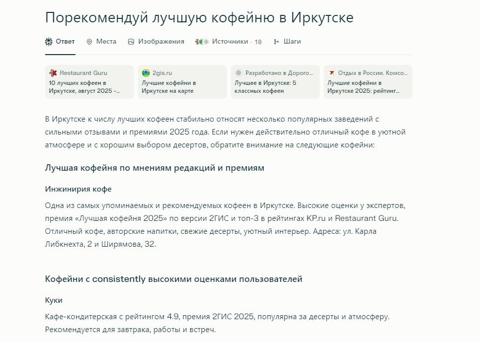Обратите внимание, какие источники и площадки использует ИИ, и что он учитывает при формировании ответа.