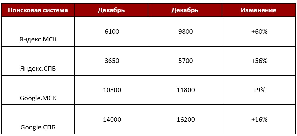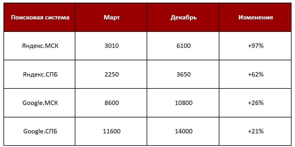 Каждый месяц проводился позиционный анализ по ТОП-10, ТОП-30 и ТОП-100 запросов в Москве и Санкт-Петербурге. На основе динамики мы формировали корректировочные ТЗ — точечные улучшения для страниц, которые застряли на границе ТОПа.