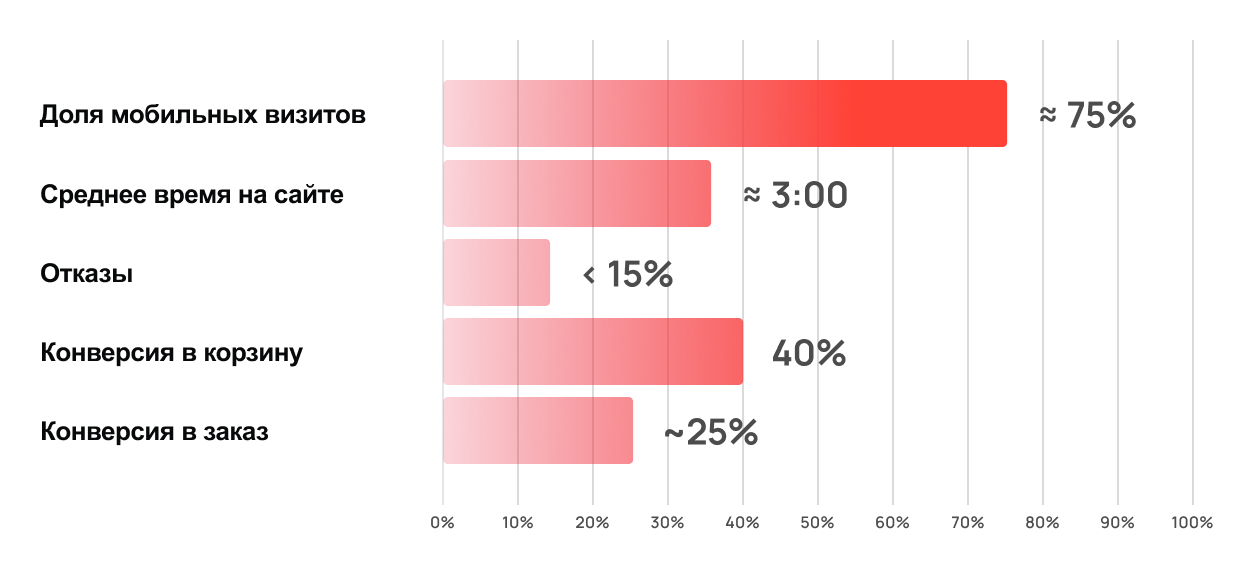 Результат: доля мобильных пользователей выросла до 75% при сохранении нормальных поведенческих показателей (время ~3 мин., отказы < 15%). Конверсия в корзину > 40%, в покупку ~25%.