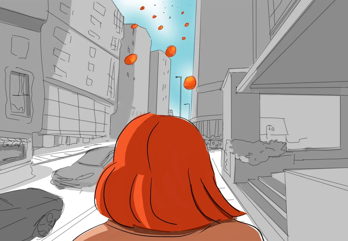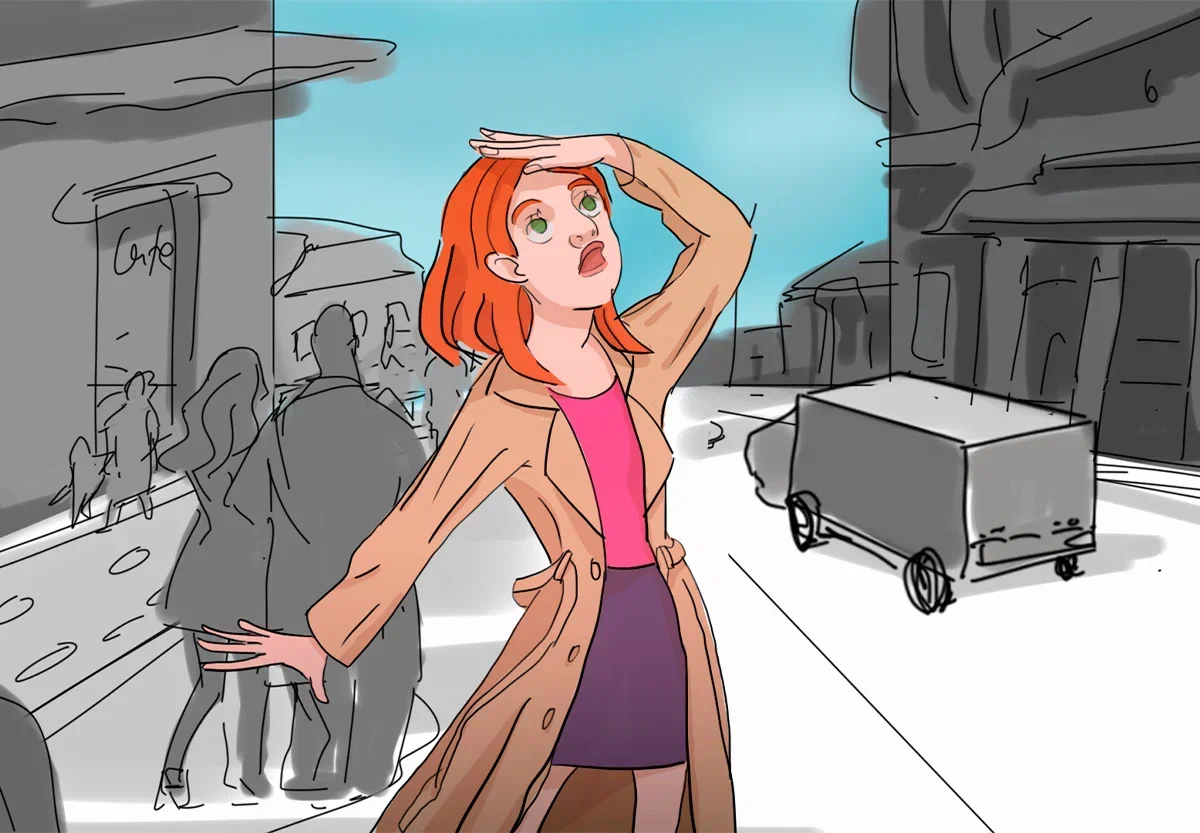 2. Вторым кадром показываем персонажа, стоящего посередине улицы. Девушка с недоумением смотрит вверх.