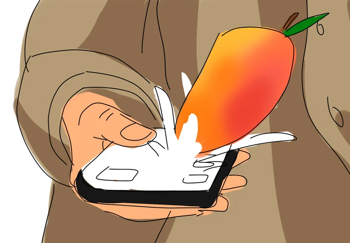 5. Пятым кадром показываем руку героини с телефоном крупным планом. Одно манго падает девушке в экран и растворяется в экране.