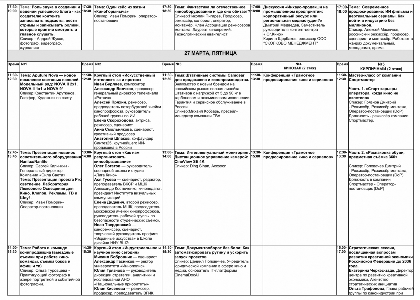 • Конференции, посвященные развитию региональных кинокластеров, подготовке специалистов киноиндустрии в системе среднего профессионального образования и возможностям инхаус-продакшенов на предприятиях.
