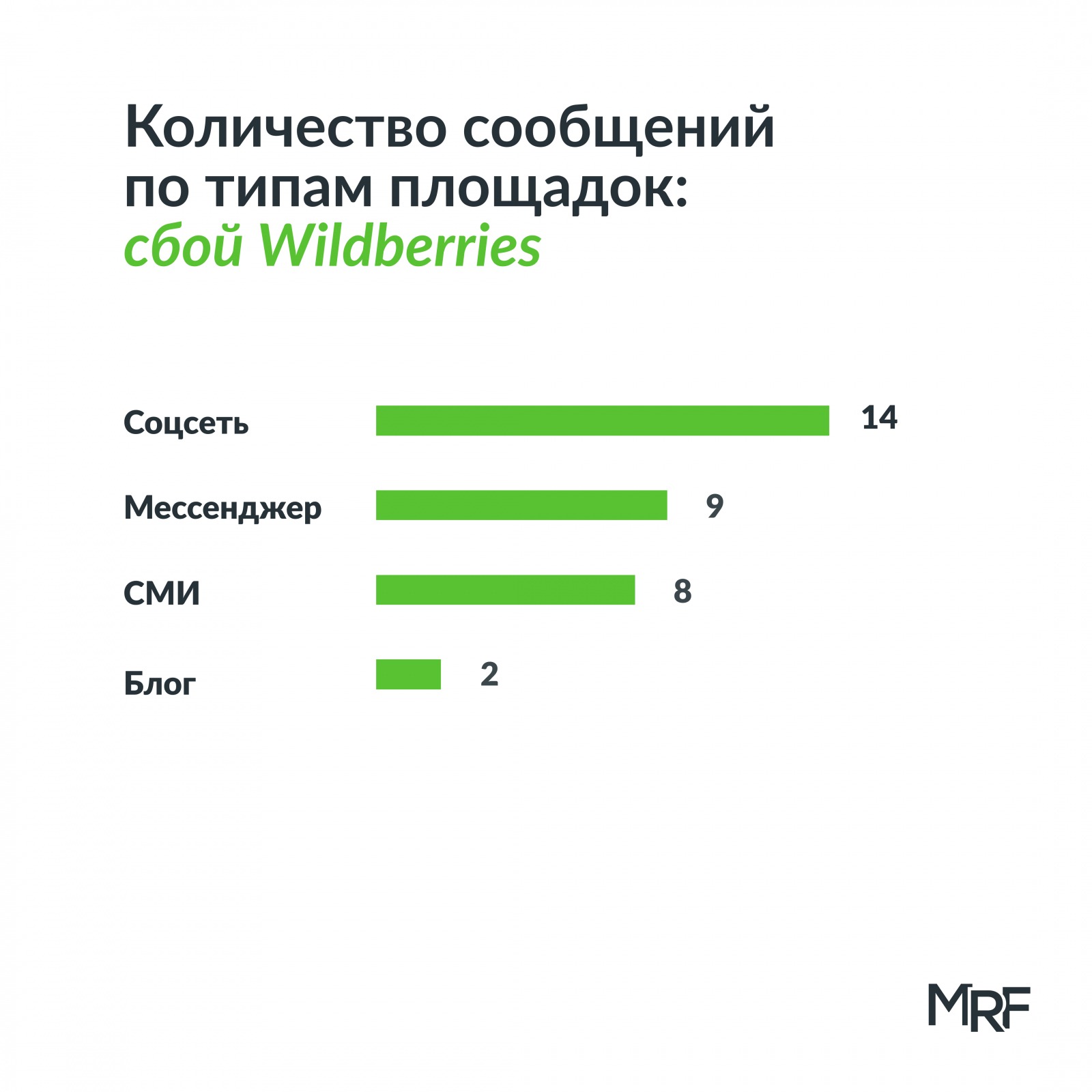 Большая часть сообщений о сбоях распространялись в соцсетях (14 сообщений). Наибольшая активность источников наблюдается в период сбоя, после 14:00 количество сообщений о сбое снижается.