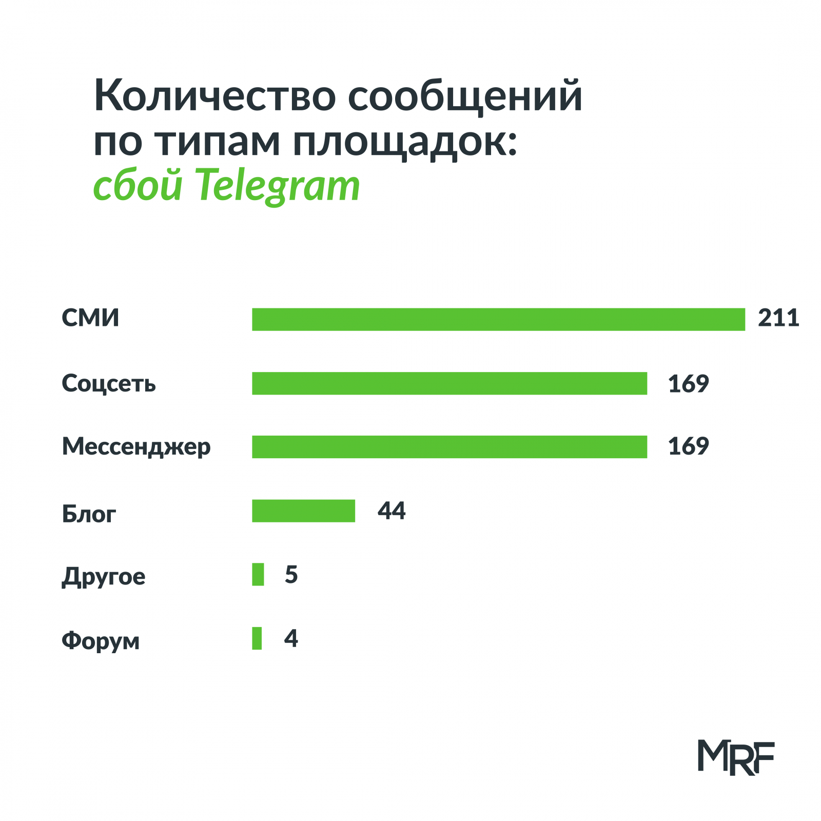 Активнее всего сообщения о сбоях распространялись в публикациях СМИ (211 сообщений). При этом наблюдается большое количество сообщений в социальных сетях и мессенджерах (по 169 сообщений). Наибольшая активность источников наблюдается в период сбоя, после 15:00 количество сообщений о сбое снижается.