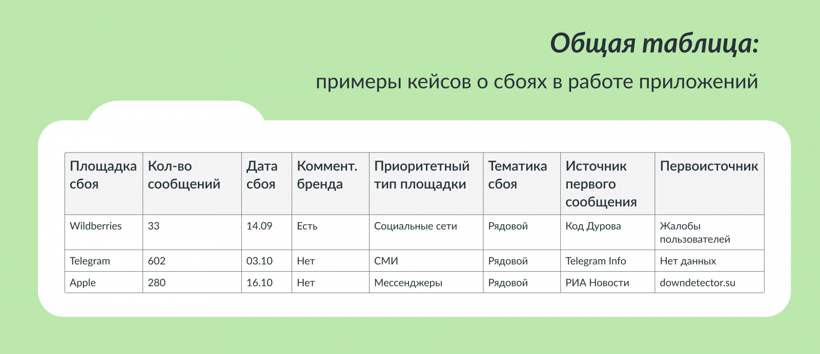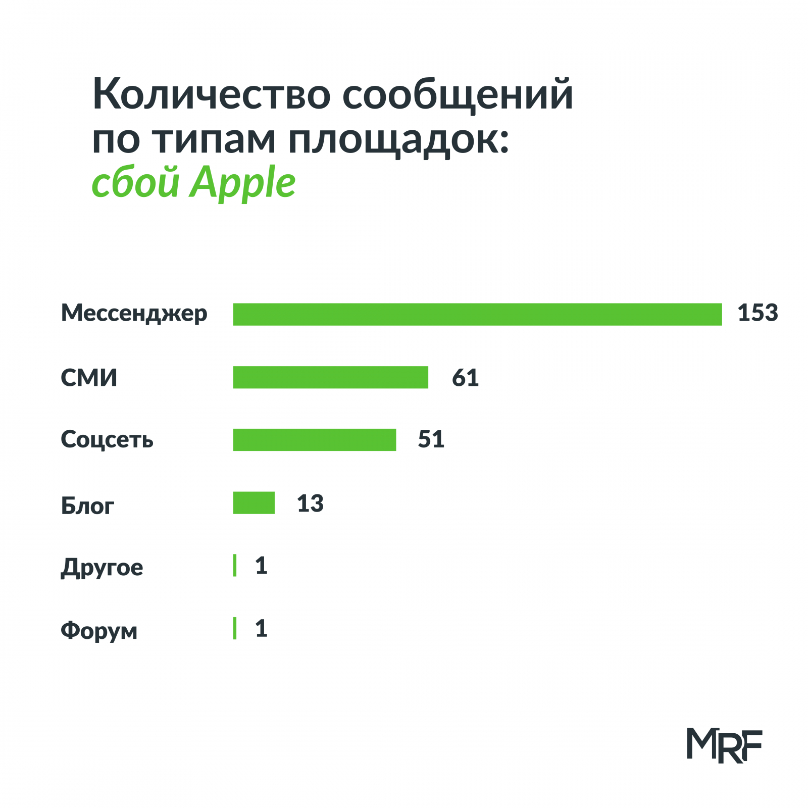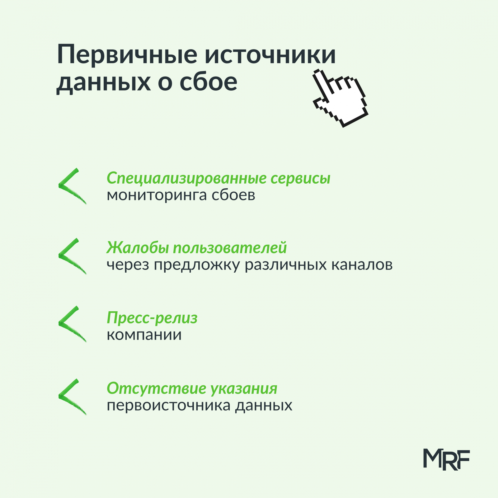 В рамках исследования мы в агентстве MRF проанализировали 14 наиболее резонансных сбоев в работе различных сервисов и отследили, как стартует новость, которую принесли в сеть пользователи. Сбои отбирались по количеству сообщений в социальных медиа, которые были опубликованы за исследуемый период.