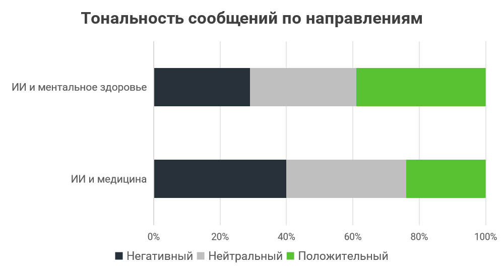 Лидирующую позицию по частоте обращений к искусственному интеллекту заняли вопросы, связанные с ментальным здоровьем. Но несмотря на высокий уровень заинтересованности данным видом психологической помощи, из-за отсутствия у ИИ эмпатии и этической ответственности, пользователи относилиськ нему с опасением.