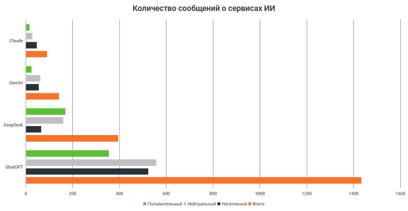 В тройку лидеров вошли ChatGPT, DeepSeek и Gemini. Значительно реже люди обращались к Claude, GigaChat и Яндекс.Нейро.
