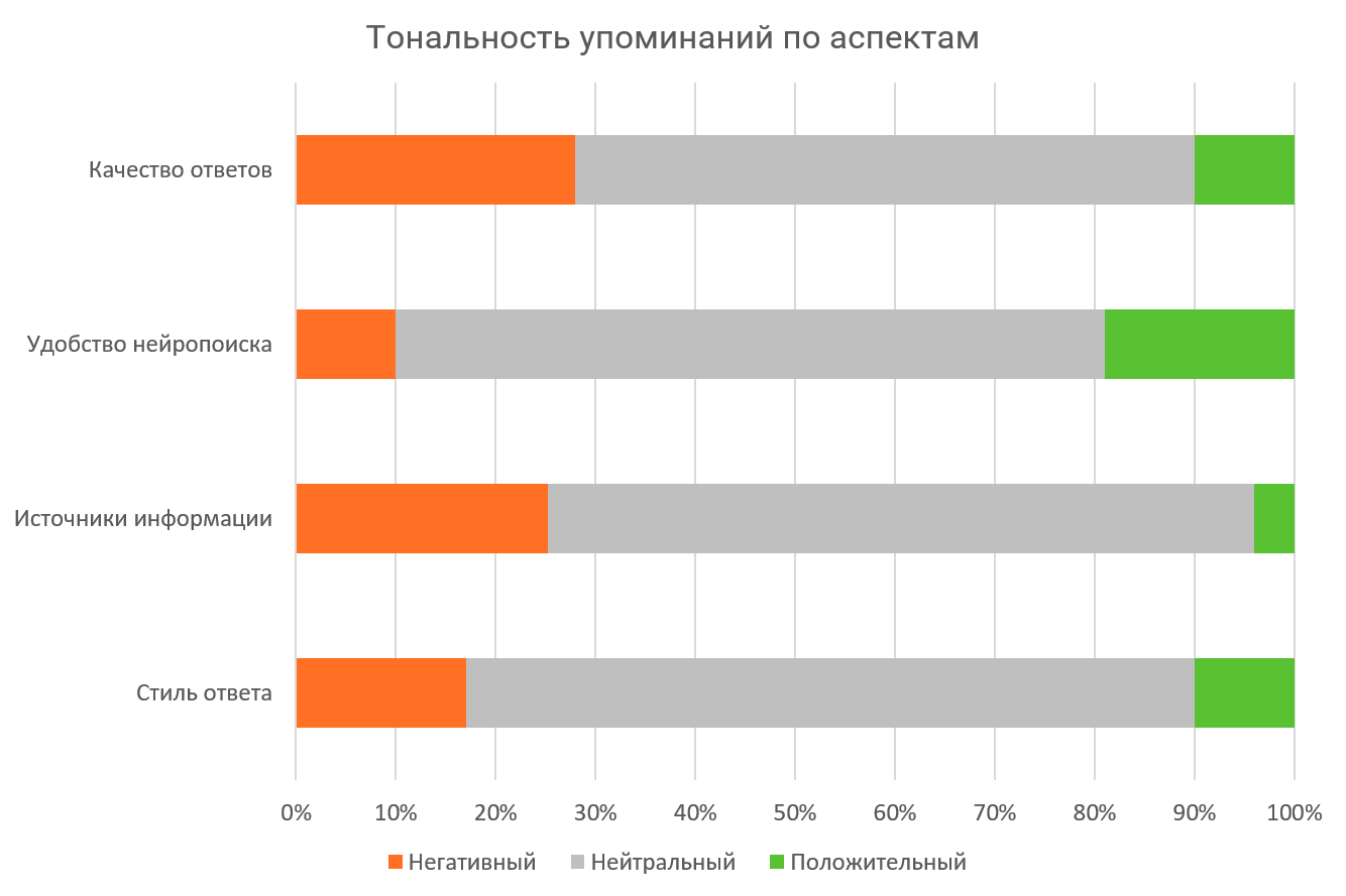 В большинстве случаев пользователи высказывались о нейропоиске либо нейтрально, либо негативно. Положительные оценки встречались реже. Чаще всего обсуждались фактология и глубина проработки ответов, стиль подачи информации, подбор источников, быстрота и легкость получения данных.
