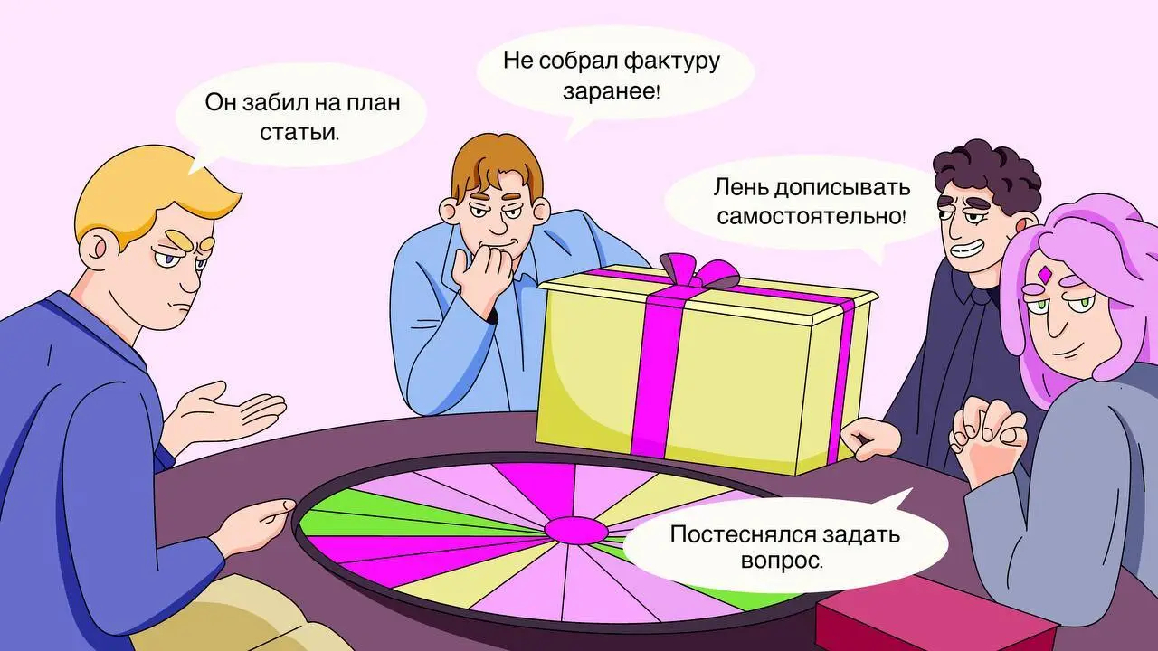 Черновик — зло, потому что это моральное разрешение для автора сделать средненько. Он приносит сырую работу с посылом «я что-то сделал, а дальше давайте вместе допилим». Но работа автора — сдать готовый материал. Для этого на подготовительном этапе он готовит план, собирает фактуру, задаёт вопросы.