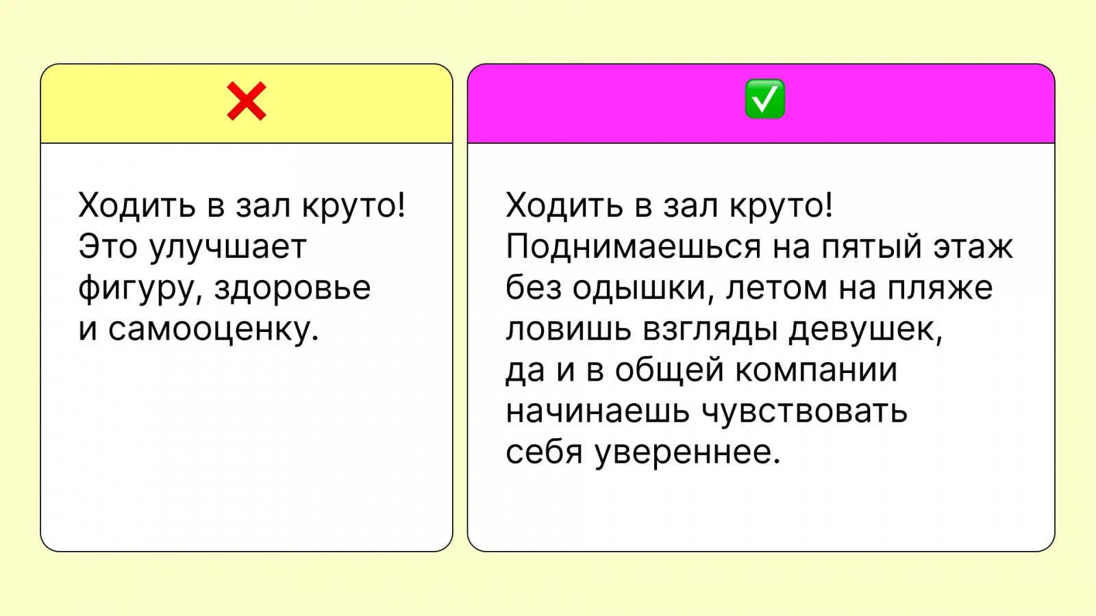 Мы передали один и тот же смысл, но во втором случае нарисовали в голове у читателя ситуацию, чтобы абстрактное «круто» превратилось в понятное «круто».