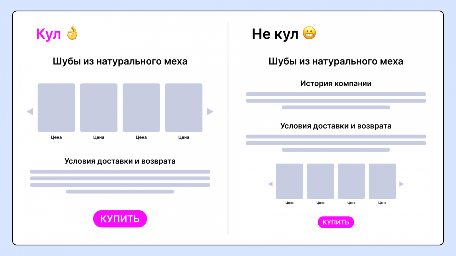 Бизнес видит тенденцию, поэтому переносит коммуникации в интернет. Проблема в том, что часть бизнесов делает это по старинке: стараются побольше рассказать о товаре, только теперь не вживую, а на сайте. И вот покупатель загуглил «купить шубу», зашел на сайт и вместо адекватного каталога с условиями доставки и возврата видит сео-заголовки и простыню об истории возникновения шуб.