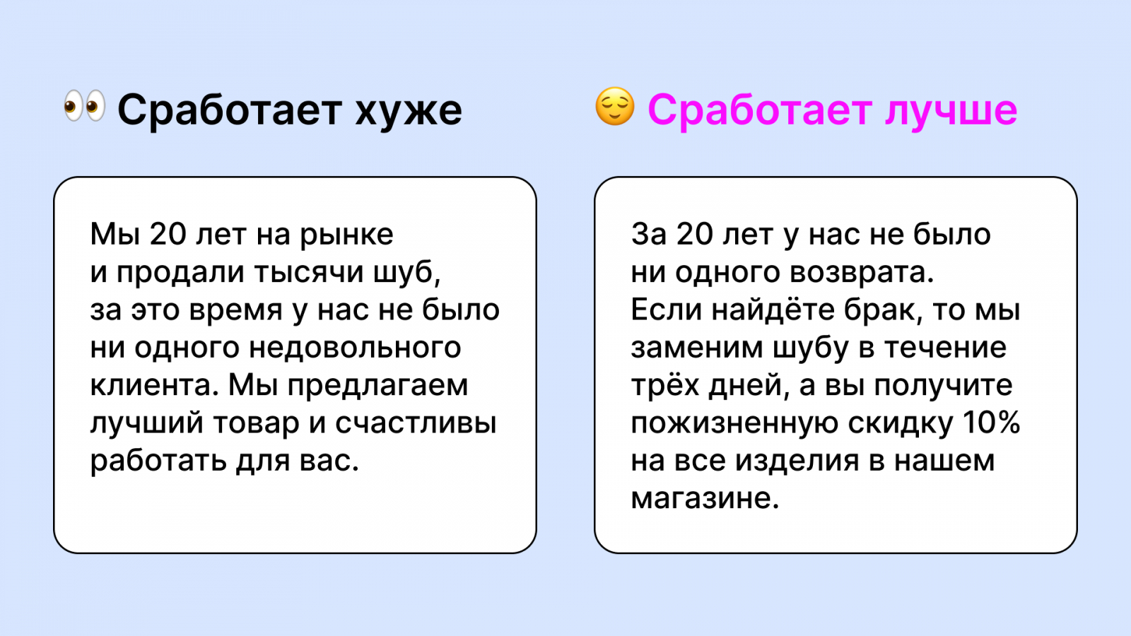 Поставьте себя на место человека, который хочет купить шубу, но переживает, что потратит много денег на некачественный товар. Что из этого убеждает лучше?