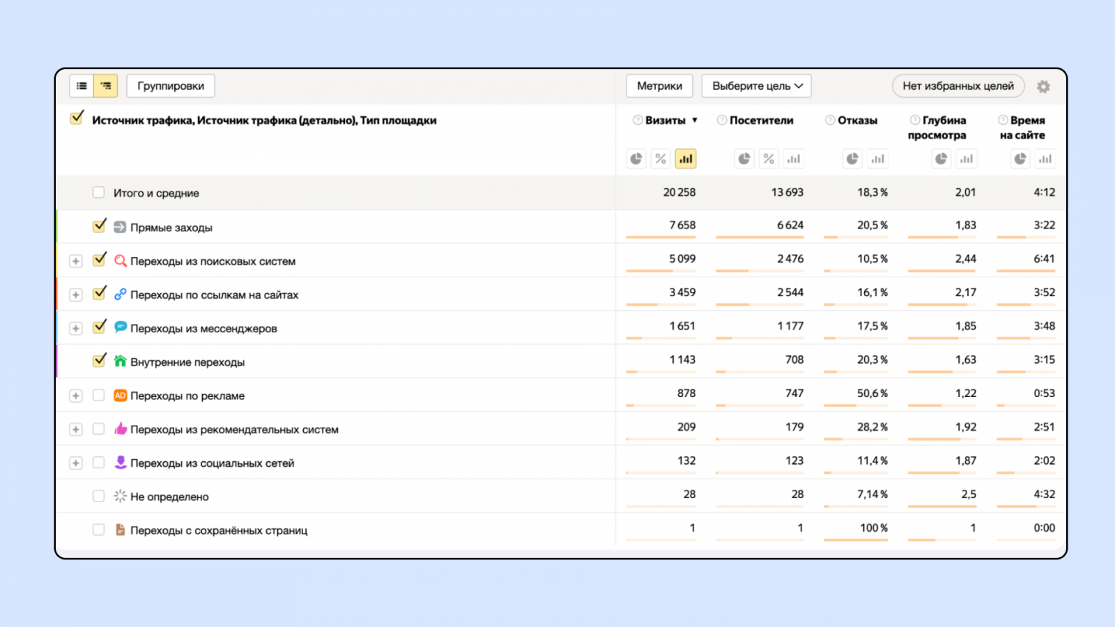 Источники трафика. Показывают, откуда на ваш сайт пришли пользователи. Если вы хотели собирать поисковую выдачу, но видите, что её нет, нужно работать над сео-оптимизацией. Заказали рекламу у блогера в телеграм-канале, но все переходы, наоборот, из поиска — реклама не сработала.
