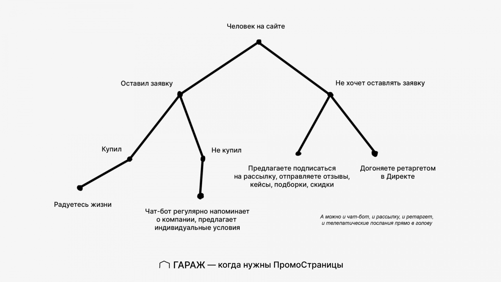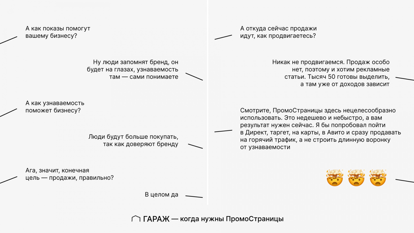 Однако бывает, что клиент хочет одно, но после часового созвона оказывается, что ему нужно совсем другое. Например, предприниматель с простым продуктом рассказывает, что хочет раскачать медийку, будет оценивать эффективность Промо по количеству показов.