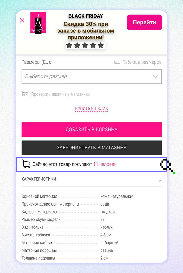 Хорошо продают пустые стеллажи и бейджи «бестселлер»: если мы видим, что товар раскупают, он привлекает больше нашего внимания.Такую механику мы использовали на сайте интернет-магазина Rendez-Vous. Теперь, когда пользователь открывает товар, мы показываем ему счетчик: сейчас товар просматривают столько-то людей. Это подтверждает, что товар хороший, и подстегивает как можно быстрее сделать покупку.