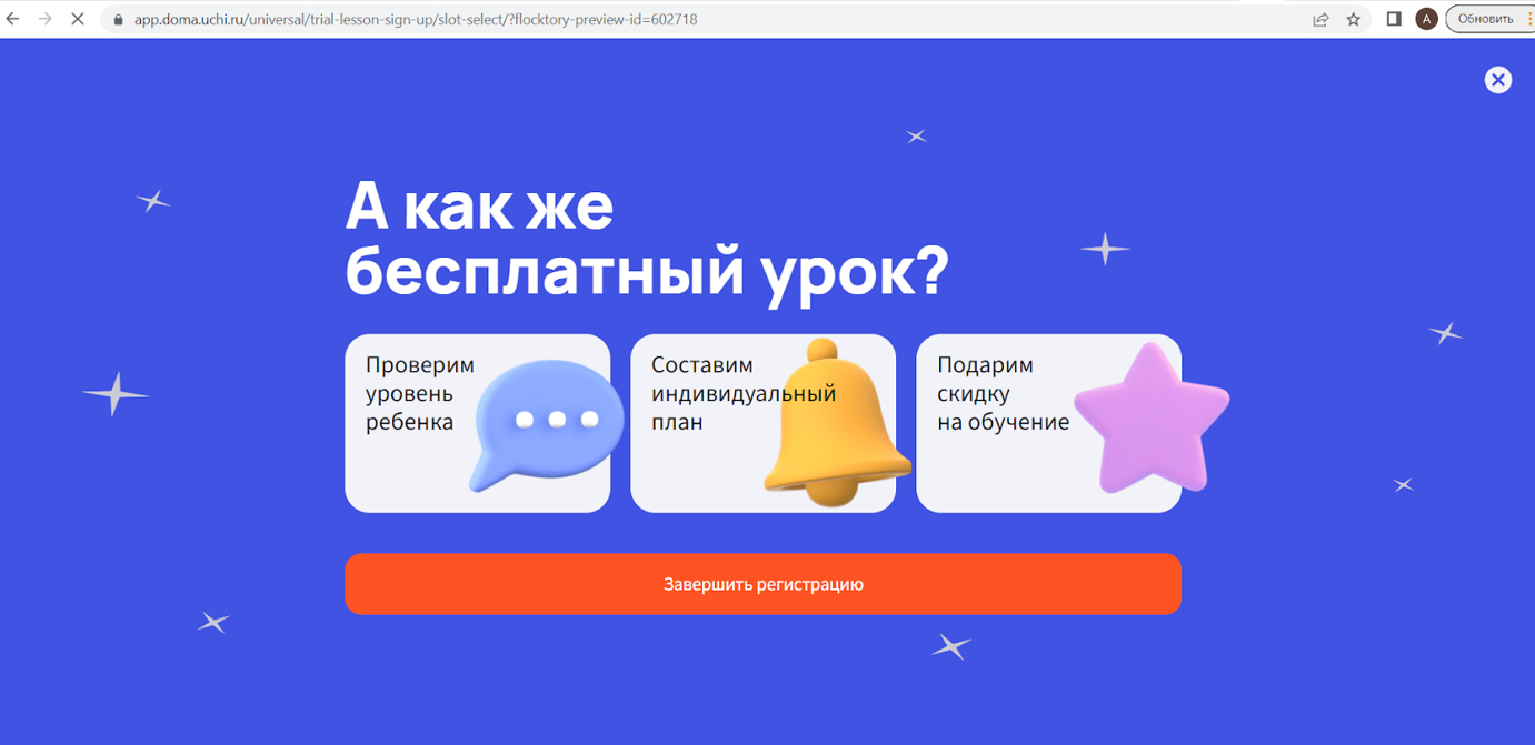 На сайте нашего партнера Учи.Дома мы настроили такой виджет: если видим, что пользователь начинает вести курсор в сторону закрытия сайта, мы показываем ему большой баннер-заглушку с персонализированным предложением. Предложение подстраивается под предыдущее поведение пользователя.