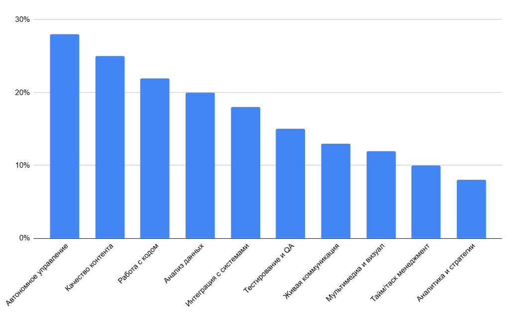 - Обработка и анализ данных (17%): транскрибация, суммаризация, анализ CSV/JSON и извлечение информации.