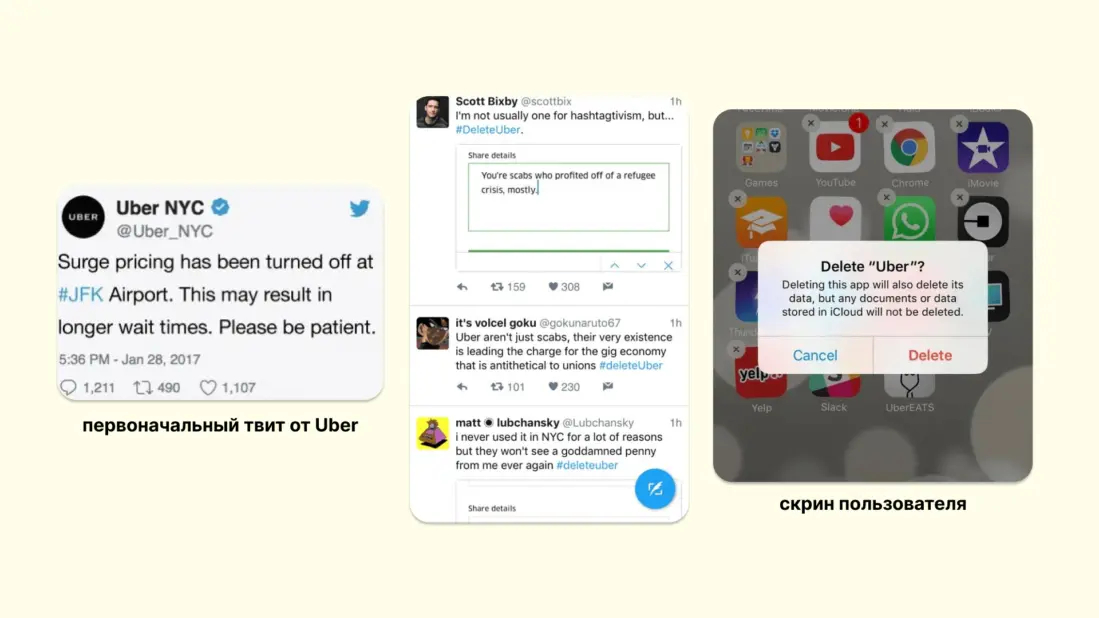 #DeleteUber стал одним из самых популярных хэштегов в Twitter. Всё началось с новостей о том, что Дональд Трамп не намерен посещать мусульманские страны. В знак солидарности с мусульманами по всей территории США начались протесты. Профсоюз таксистов Нью-Йорка призвал не обслуживать клиентов у Аэропорта Кеннеди. Uber не поддержал забастовку, и получил дизреспект — более полумиллиона пользователей удалили свои аккаунты.