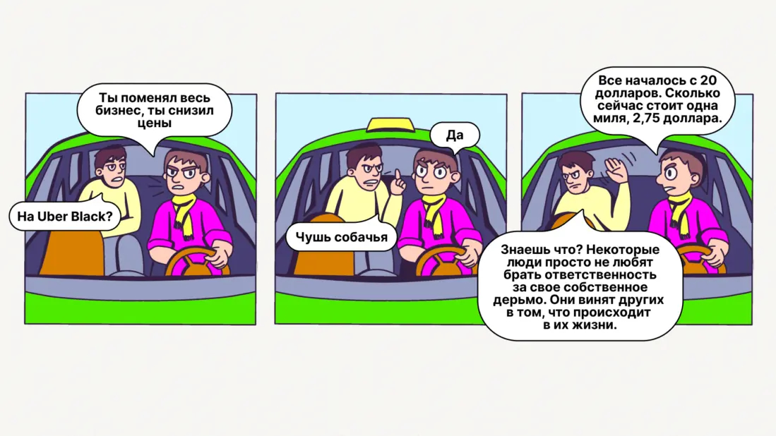 В том же злополучном году Каланик попал в объектив камеры, установленной в машине таксиста Uber. Водитель в разговоре пожаловался на грабящие тарифы от приложения. Каланик вскипел и накричал на таксиста: «Некоторым людям не нравится брать на себя ответственность за собственное дерьмо… Они винят во всем кого-то другого».