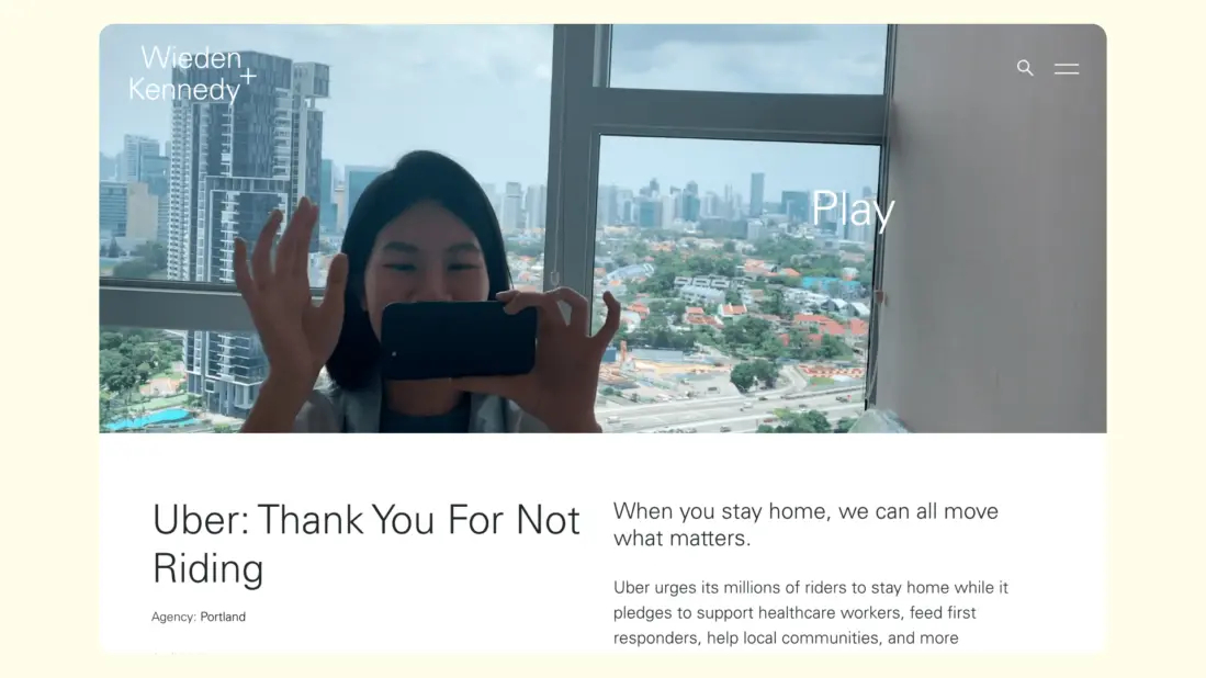 В пандемию Uber сделал себе антирекламу. В ходе кампании Thank you for not riding сервис благодарил людей за то, что они не ездят на такси во время самоизоляции. Таким способом бренд показал себя ответственным перевозчиком и повысил уважение к себе среди пользователей. Чтобы закрепить эффект, компания организовала 1 миллионов бесплатных поездок для тех, кто продолжал работать очно, и доставку продуктов для нуждающихся.