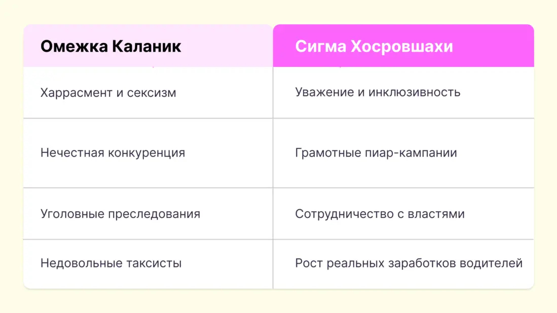 Спустя 2 месяца после ухода из компании Каланика новым главой стал Дара Хосровшахи. Он сразу изменил подход в коммуникациях. При Каланике существовали 14 незыблемых принципа Uber. В списке были такие пункты, как: «веди агрессивную игру» или «твори волшебство». Хосровшахи избавился от лишних принципов и ввел новые, которые касались инклюзивности, заботе о клиентах и уверенности в правоте своих действий.