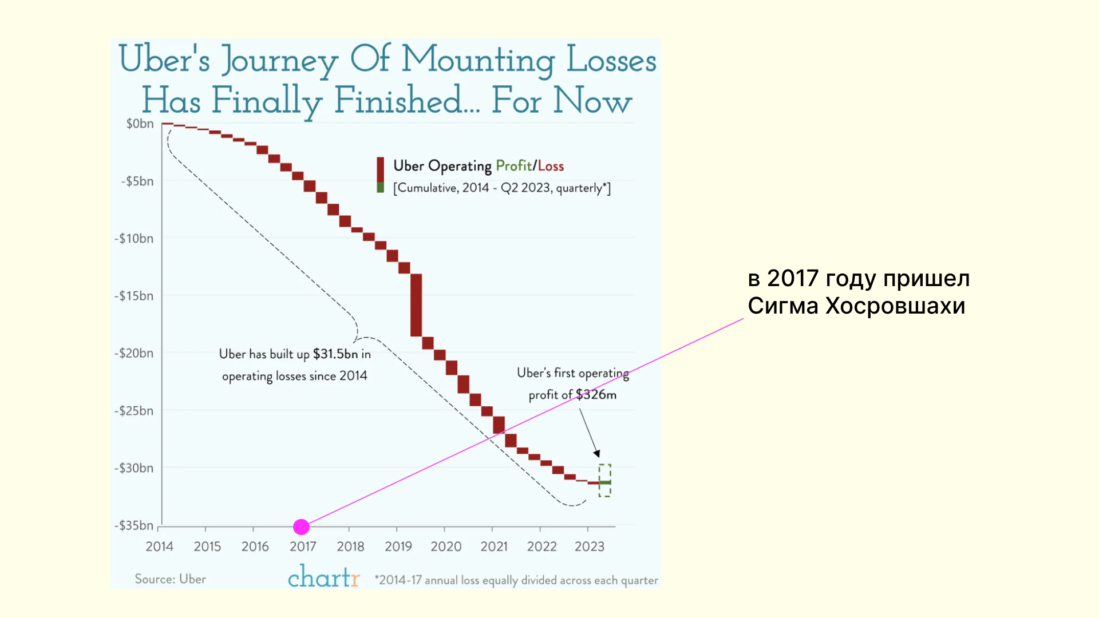 Теперь представьте, что вы досмотрели фильм, экран гаснет и финальным белым титром на черном фоне вы видите следующий текст: «В 2023 году Uber впервые за свою историю объявил о том, что вышел в плюс». Да, Хосровшахи это удалось. Даже несмотря на то, что он не был основным кандидатом на замену Каланику.