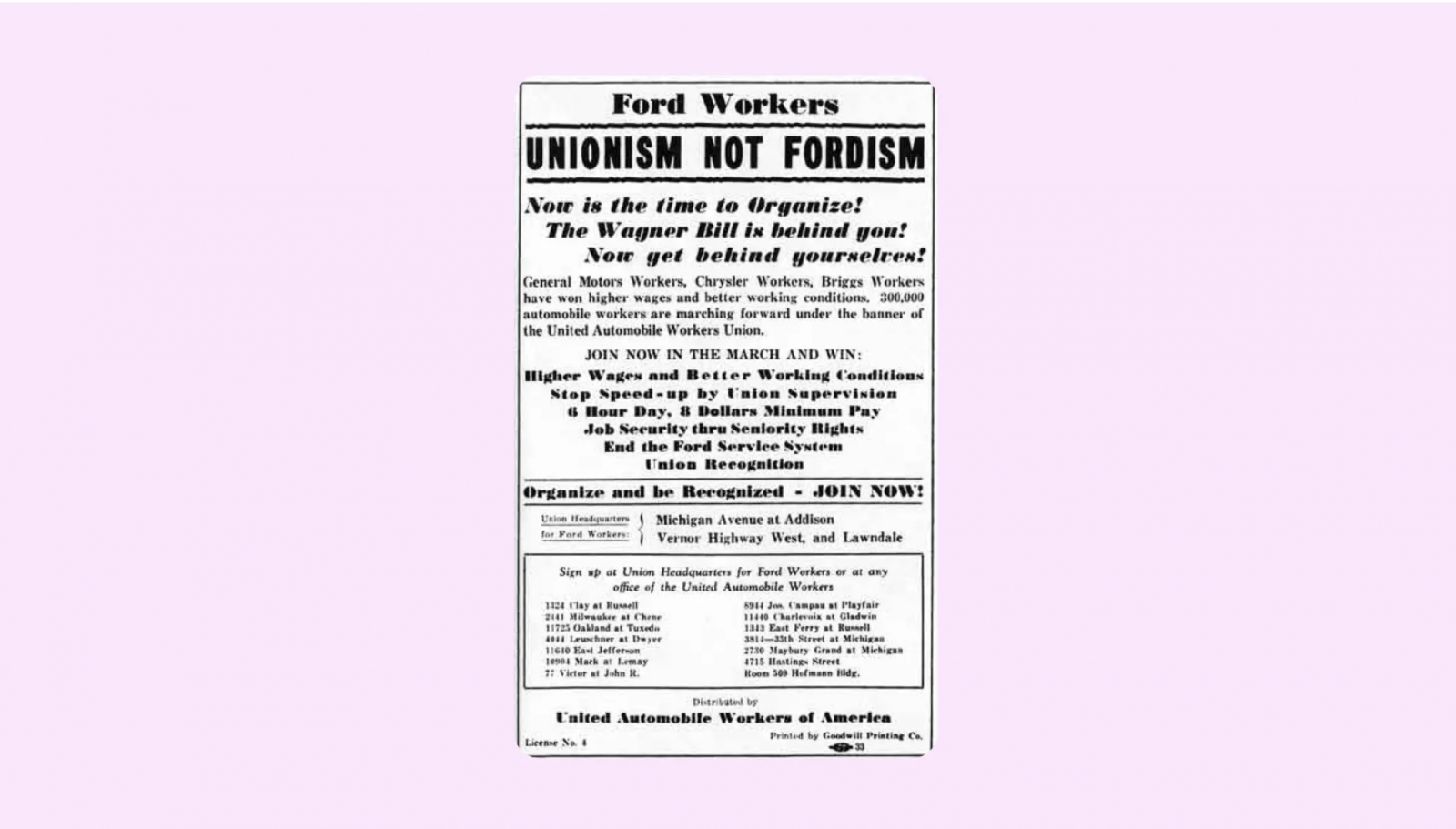 В 30-х Уолтер организовал профсоюз UAW (The United Auto Workers) — объединение работников автомобильной промышленности, которое в итоге и положило Детройт на лопатки.