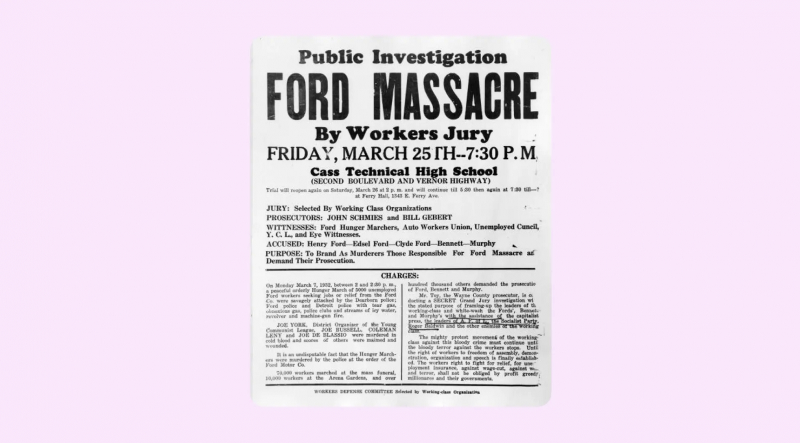 Генри Форда пресса начала размазывать по полной. Ранее в 1932 году случился голодный марш — шествие из 5 000 человек, которое в заголовках обозначали как «резня Форда». В прессе тогда писали, что Голодный Марш сначала проходил мирно, но когда шествие приблизилось к заводу Форда, то людей встретили дубинки и пули. Пять рабочих погибли. Генри Форд тогда огрёб от прессы сполна.