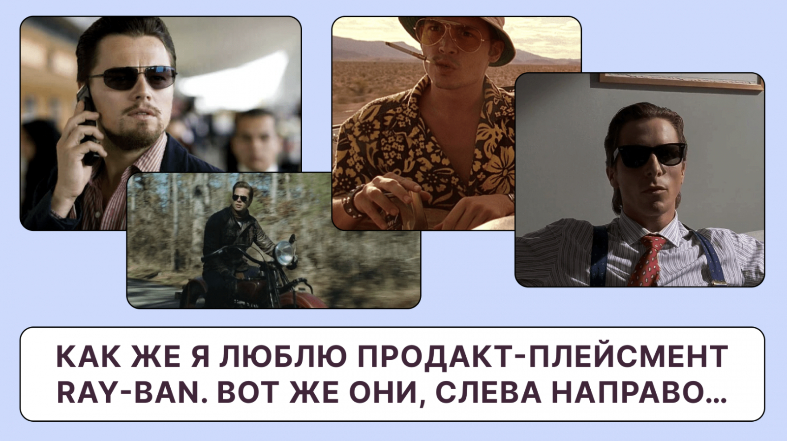 Ray-ban — рекордсмены продакт-плейсмента. Ребята ещё в 50-х смекнули, что кино собирает огромную аудиторию. Нужно только продать ей образ, например, брутального героя в солнцезащитных очках. И вот это уже не просто очки, а «те самые, как у Тома Круза».