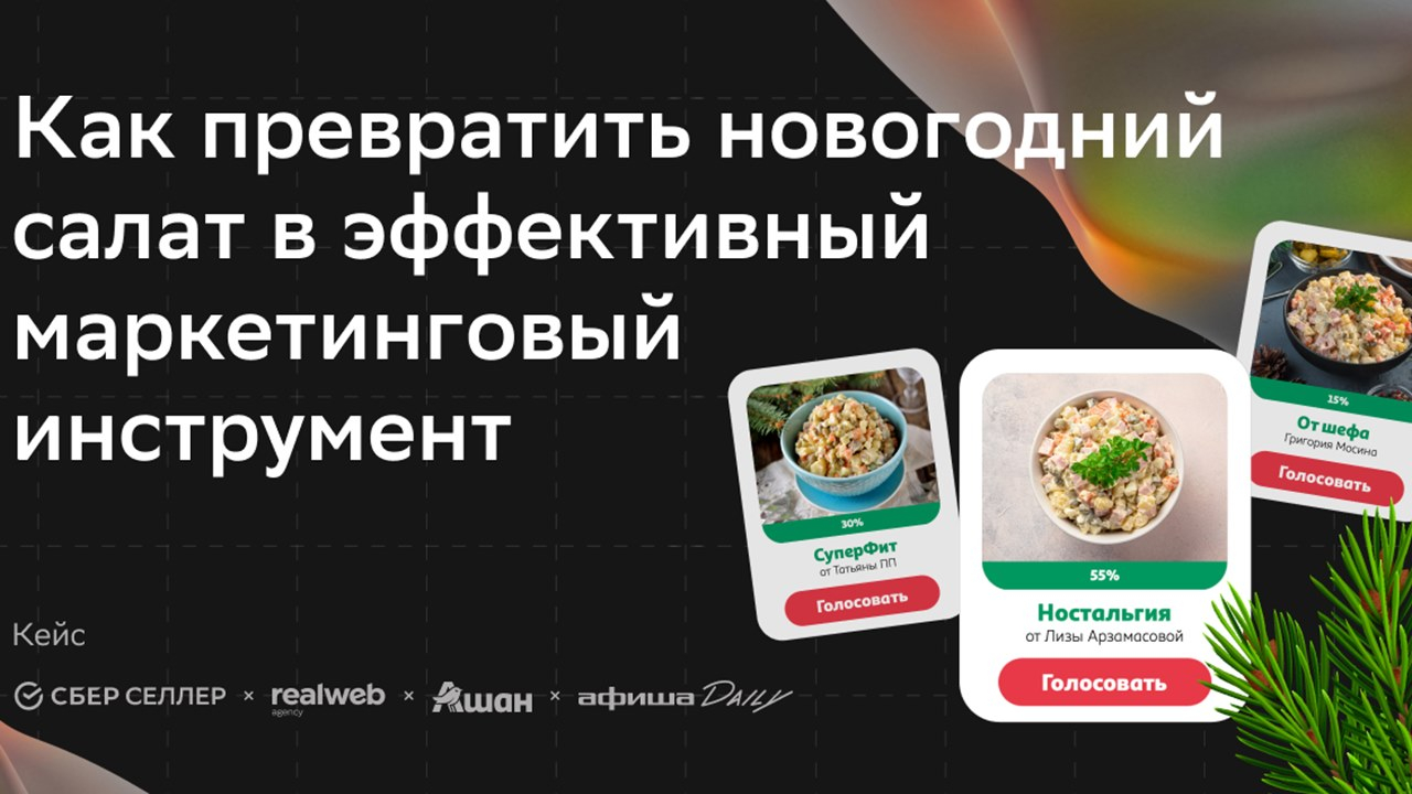 Чтобы это выяснить, проектная команда совместно с клиентом решили устроить настоящий «баттл», где люди могли бы сами выбрать лучшую версию салата. Для этого на сайте издания «Афиша Daily» специалистами «СберСеллера» был запущен специальный праздничный лендинг, на котором пользователи могли познакомиться с тремя самыми популярными воплощениями, посмотреть мастер-класс по приготовлению, а затем проголосовать за понравившийся вариант.