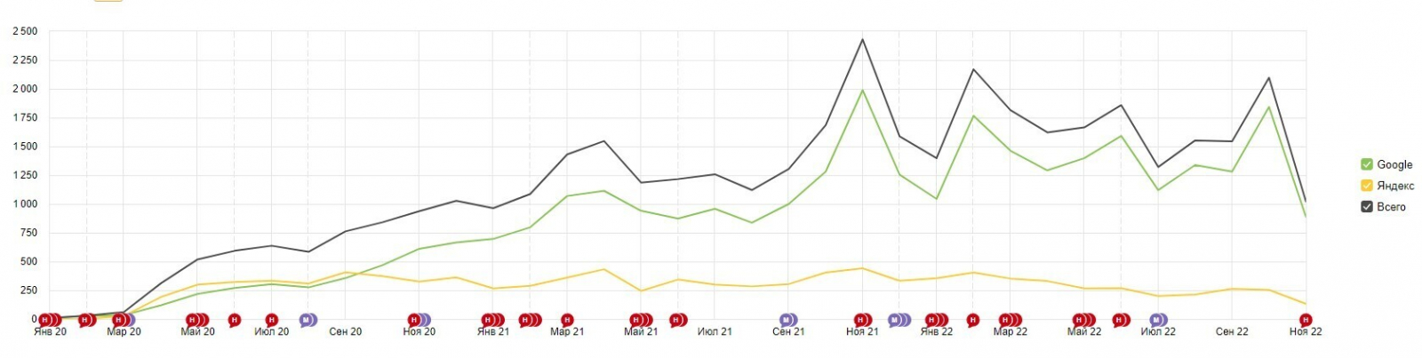 В течение почти трех лет две статьи стабильно приносят трафик — в пике до 2500 тысяч визитов: