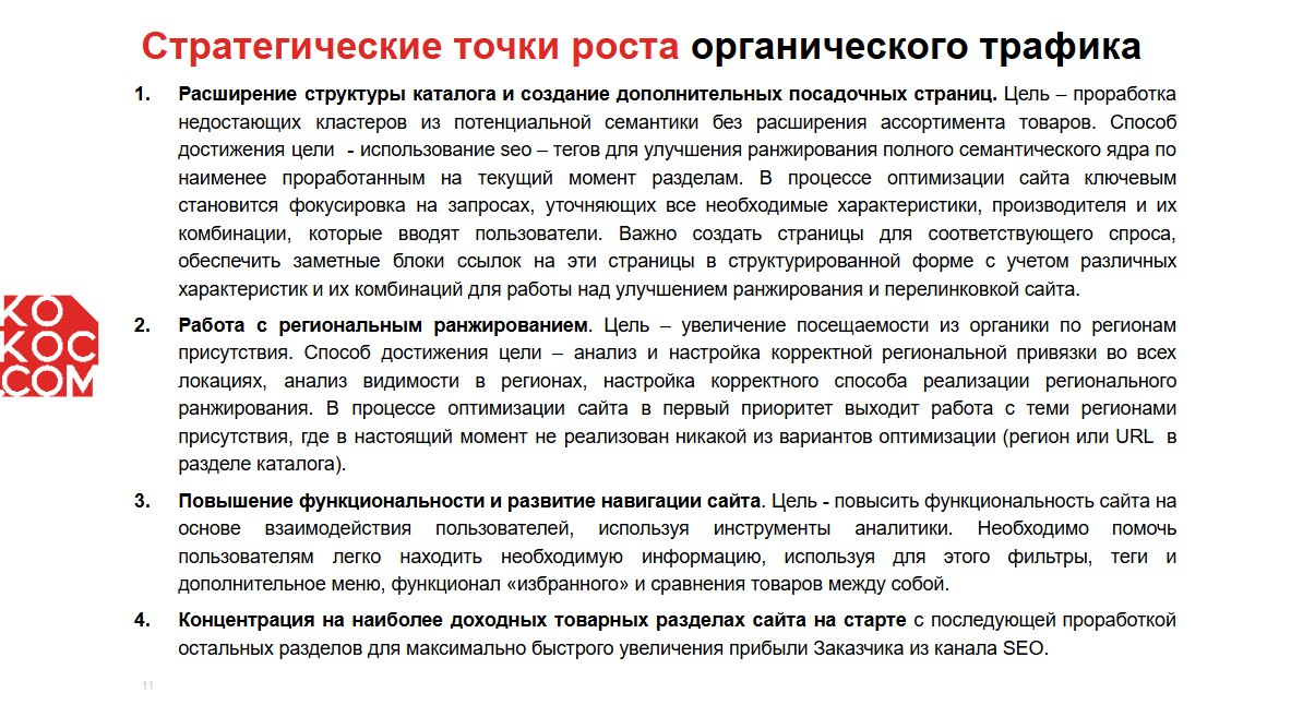 — В Kokoc.com делали КП и на 67 слайдов, если того требовала задача. Для одного сайта презентация содержала 10 слайдов аудита органического трафика, чтобы реально, а не для галочки, выявить проблему и наглядно показать ее клиенту.
