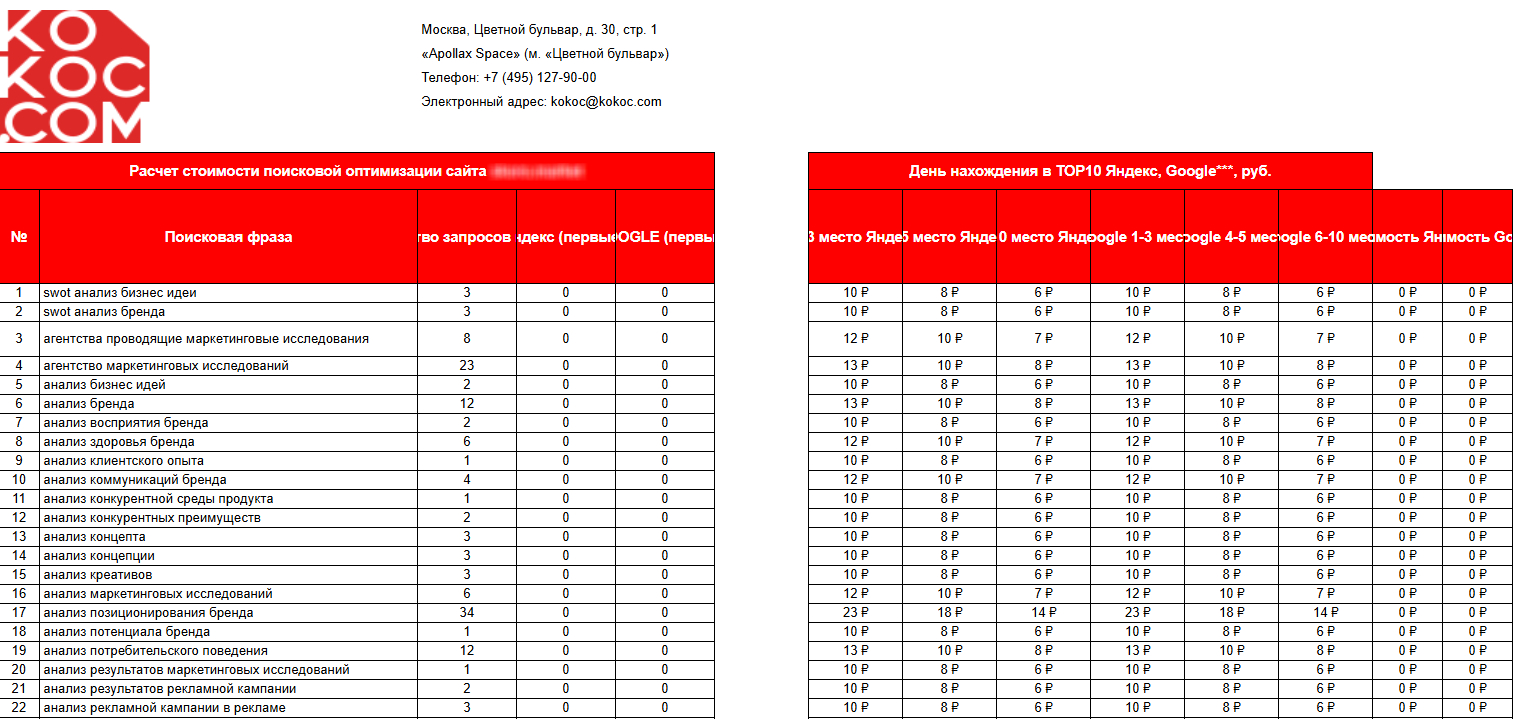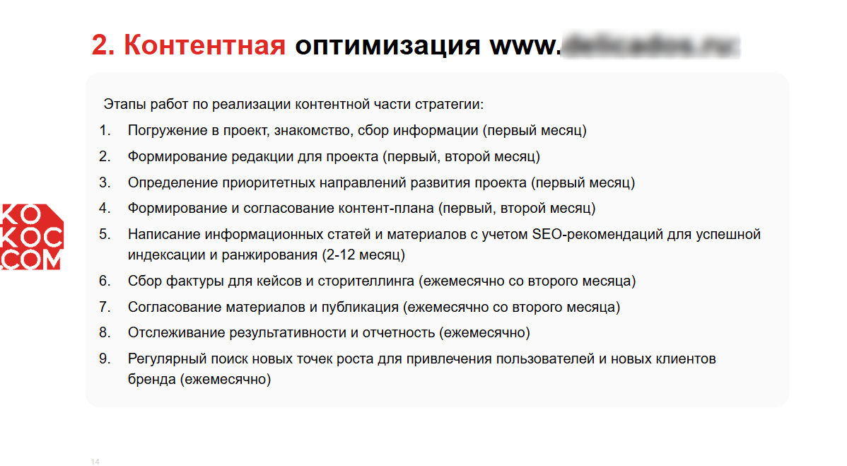Далее в КП указываются виды и стоимость работ, расчет бюджета, этапы и сроки. В качестве доп. услуги часто предлагается контент-маркетинг— чтобы наращивать информационный трафик и растить брендовый поисковый спрос с помощью нестандартных инструментов.