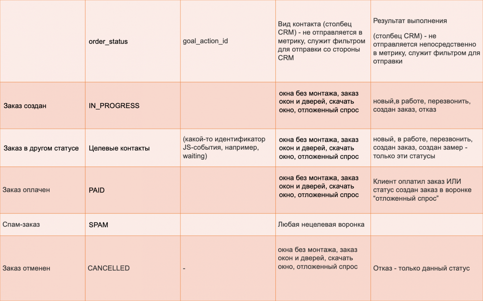 В нашем случае задача также осложнялась тем, что клиент хотел видеть в отчетах Яндекс.Метрики исключительно сделки из ограниченного числа воронок, некоторые атрибуты пришлось расписать детальнее. Мы составили таблицу со статусами заказов из воронок, которые необходимо выгружать в том или ином статусе в Яндекс.Метрику: