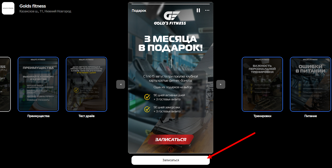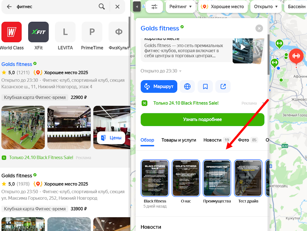 Осенью 2023 года для давнего клиента (сеть фитнес-клубов) был протестирован новый канал — сторис в «Яндекс Картах». На тот момент этот бесплатный инструмент практически не использовался в спортивной индустрии.