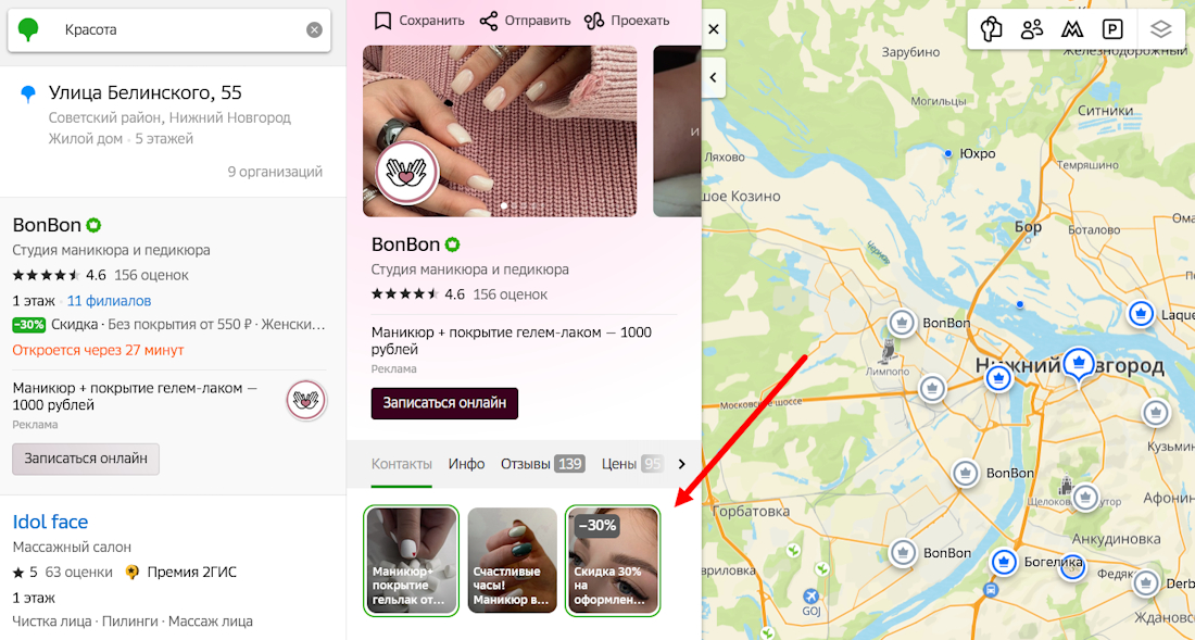 Особенность обусловлена тем, что геосервисы изначально создавались для поиска мест и адресов на карте. Механика такая: человек открывает на телефоне соответствующее приложение и ищет услугу или товар недалеко от своей локации. Заходит в карточку, видит истории и смотрит их для получения нужной информации. Часто услуга нужна здесь и сейчас, это могут быть, например, автосервисы или стоматологии.