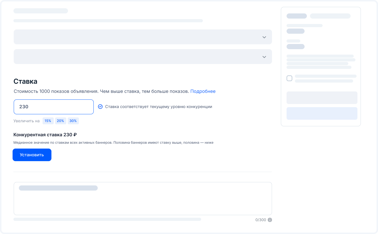 2. CPM, или оплата за показ. Минимальные ставки — 135 рублей за 1000 показов на главной и в поиске и от 250 рублей за 1000 показов в товарных категориях. При оплате за показы рекламодатель платит в размере ставки, которую он установил.