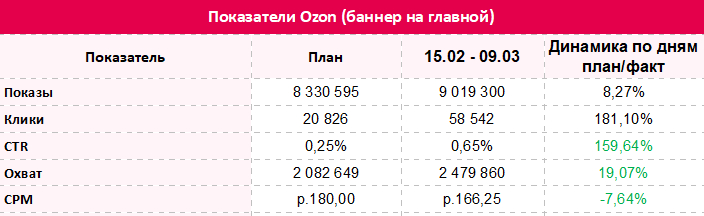 В результате кампания превзошла ожидания: Ozon показал лучшие показатели по сравнению с другими программатик-площадками — CTR 0,41%, глубина просмотра 4,8 страницы и время на сайте более 3 минут. Было получено 49 Last-click заказов, а CR Lift оказался в 3 раза выше, чем на других площадках. Наибольшую эффективность продемонстрировали таргетинг на CRM-аудиторию и видеобаннеры. Опыт признан успешным, и медийная реклама на Ozon включена в постоянный медиамикс бренда.