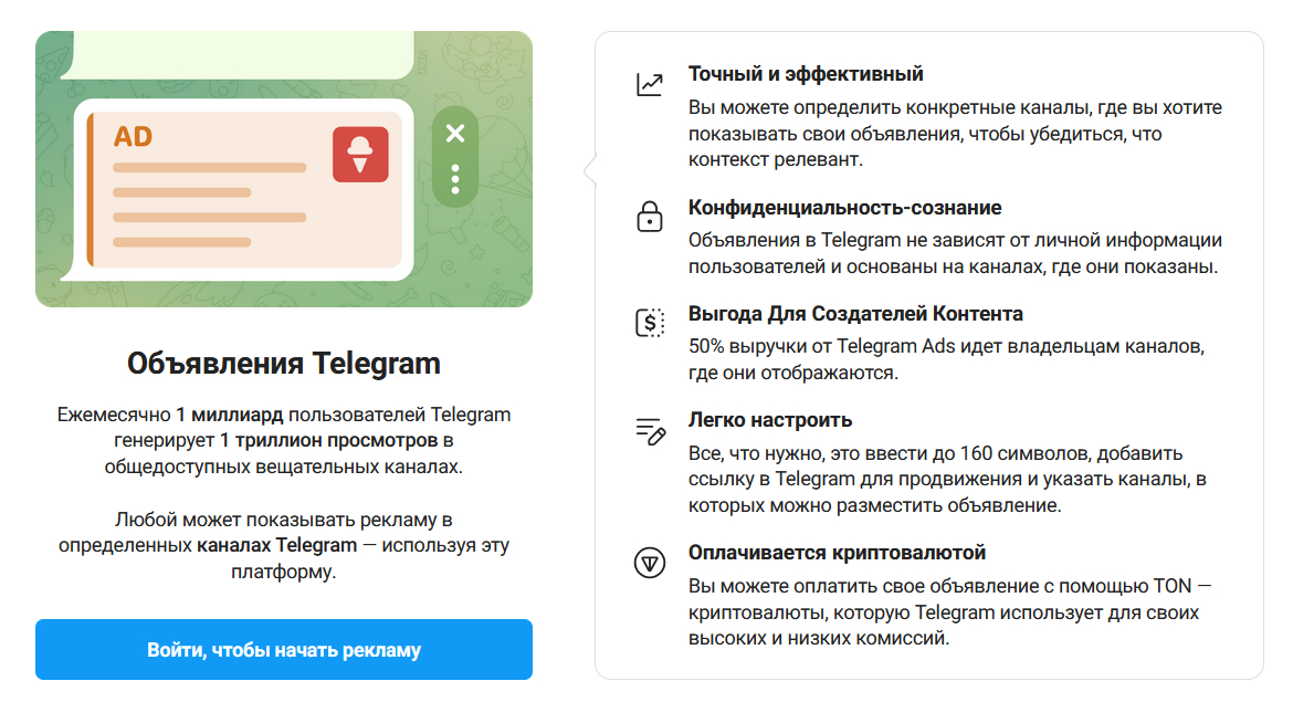 TG Ads (Telegram Ad Platform) — официальная рекламная платформа в мессенджере. Позволяет показывать ваши объявления всем пользователям, у которых нет подписки Premium. Платформа появилась в 2021 году: первоначально она предусматривала наличие космических бюджетов на продвижение — речь шла о семизначных числах, причем в евро. На текущий момент все куда скромнее, а к цифрам мы еще вернемся.