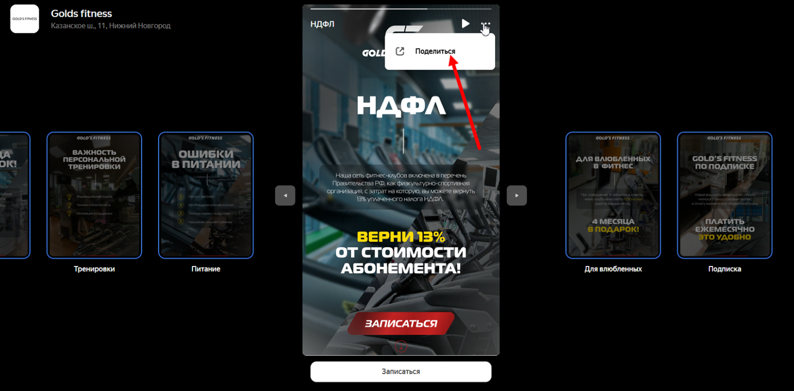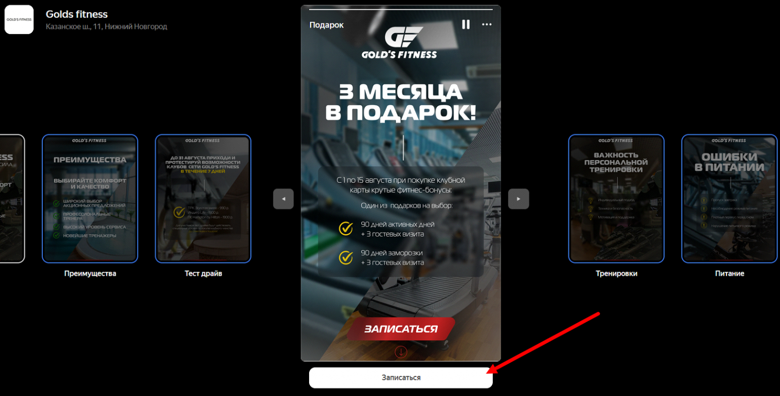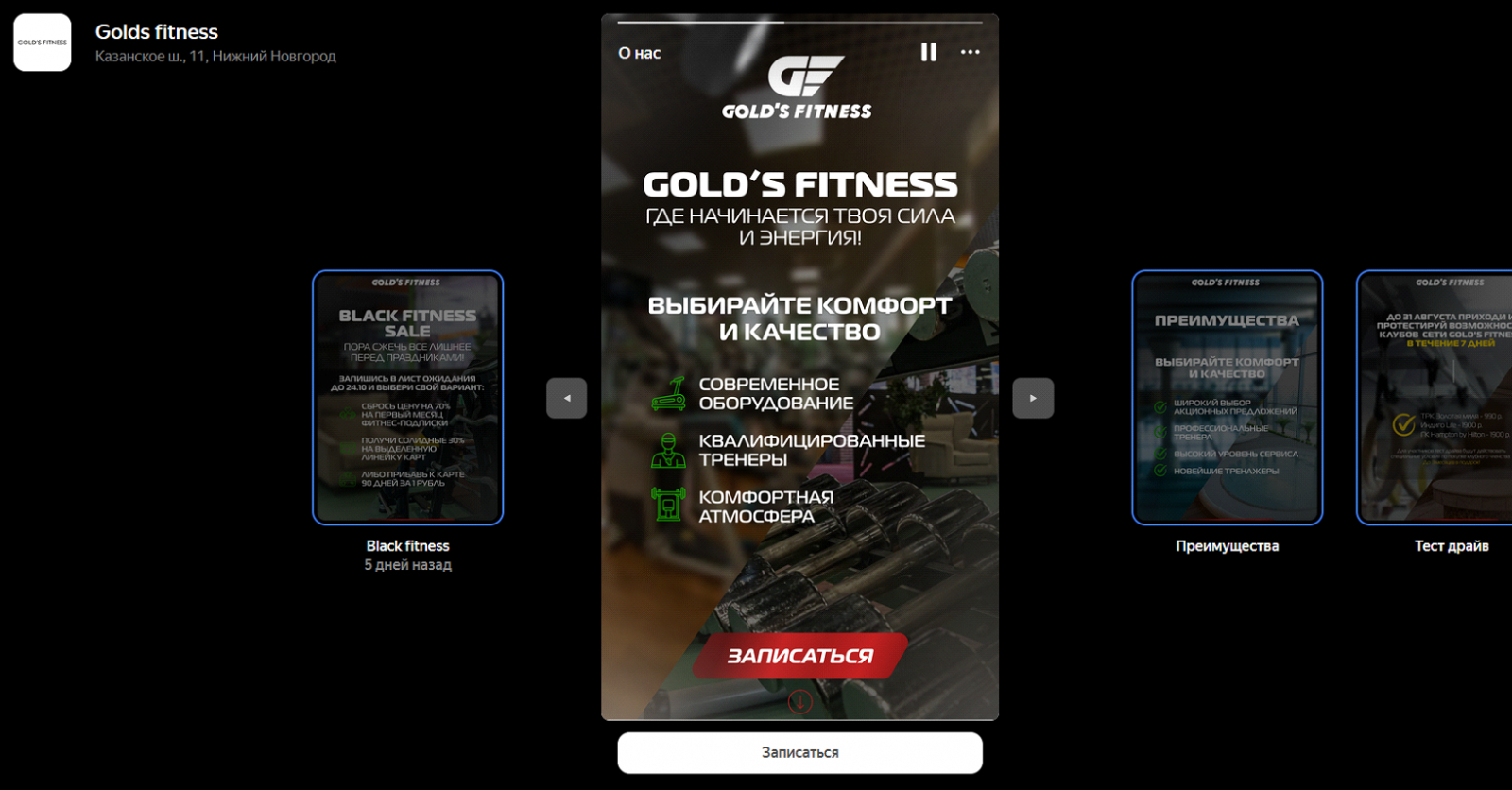 Осенью 2023 года для давнего клиента (сеть фитнес-клубов) был протестирован новый канал — сторис в «Яндекс Картах». На тот момент этот бесплатный инструмент практически не использовался в спортивной индустрии.