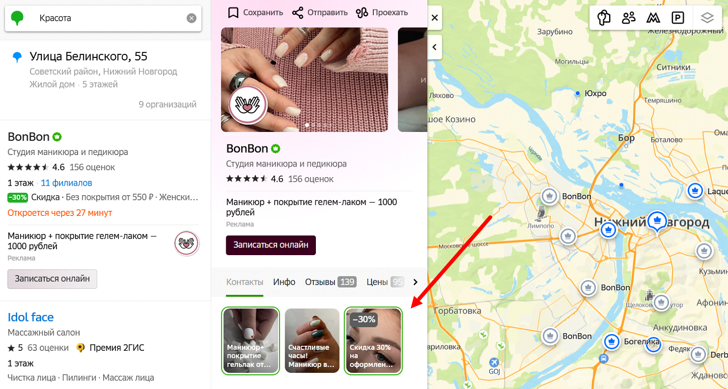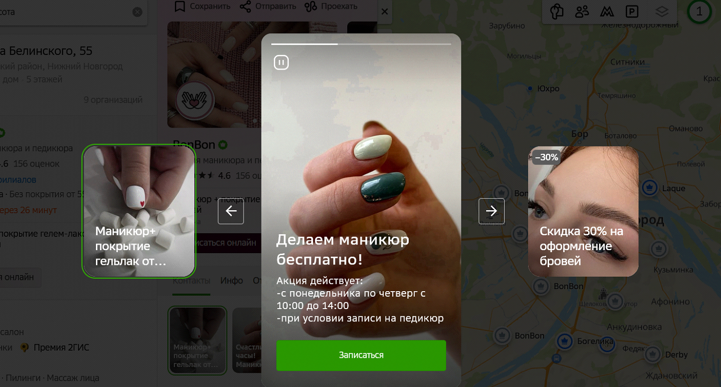 Особенность обусловлена тем, что геосервисы изначально создавались для поиска мест и адресов на карте. Механика такая: человек открывает на телефоне соответствующее приложение и ищет услугу или товар недалеко от своей локации. Заходит в карточку, видит истории и смотрит их для получения нужной информации. Часто услуга нужна здесь и сейчас, это могут быть, например, автосервисы или стоматологии.