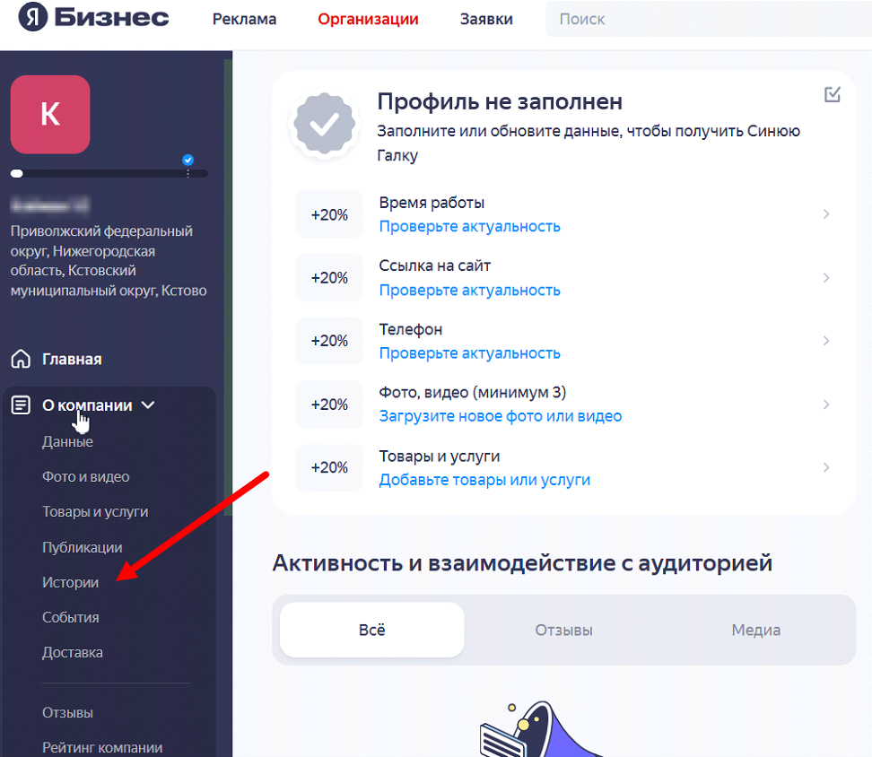 Сперва нужно войти в личный кабинет компании на «Яндекс Бизнесе». Истории находятся во вкладке «Истории» раздела меню «О компании»: