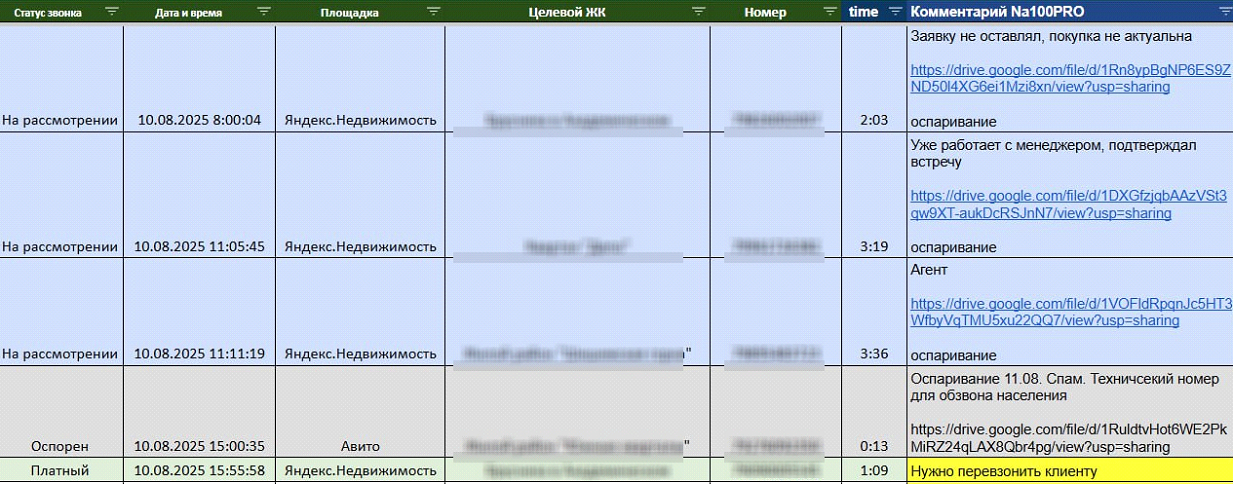У рекламных площадок свои критерии идентификации звонков, и, конечно, в интересах площадки воспринимать все обращения как целевые. Поэтому мы внедрили классификацию по критериям застройщика. Сформировали таблицу, куда вносили все звонки и оставляли по каждому из них детализированный комментарий. Это позволило нам в последующем оспаривать статус звонков.