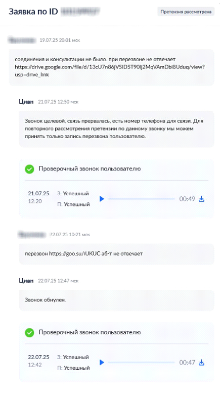 Но не всегда бывает так просто и быстро. Например, другое наше обращение площадка на начальном этапе не принимала: нужно было перезвонить клиенту, но он не брал трубку при перезвоне. Абонент не отвечал даже при повторном звонке. Мы обратились с просьбой обнулить такое обращение, но площадка считала, что дело не в отказе, а в том, что прервалась связь. Пришлось прилагать запись контрольного звонка, чтобы доказать невозможность связаться с клиентом.